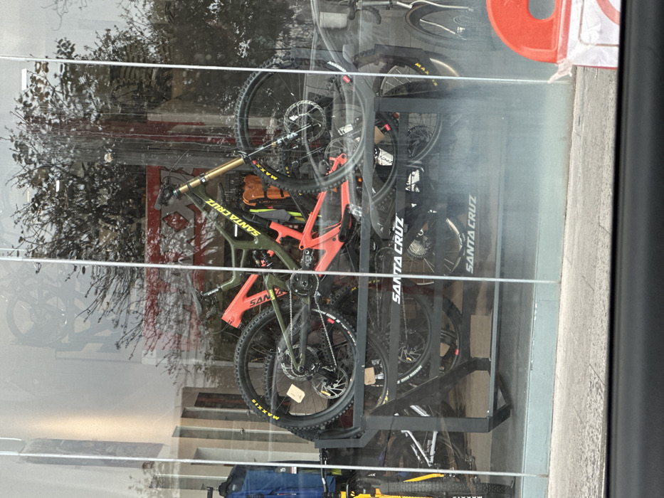 The image displays a detailed view into a bicycle shop's window, located in a commercial district of Mexico City, likely in an area such as Roma Norte or Condesa. The primary subject is a high-performance Santa Cruz mountain bike, presented with an olive green frame featuring coral-orange accents on the rear triangle and suspension linkage. The bike is equipped with gold-colored fork stanchions and Maxxis-branded tires. It rests on a black metal, multi-tiered display rack, which prominently features the "SANTA CRUZ" logo in white. Within the shop's interior, additional bicycles, cycling apparel including a blue jacket, and accessories such as an orange backpack are visible on racks. The large glass storefront reflects the exterior environment, showing clear reflections of trees, an overcast sky, and indistinct building facades. A grey concrete sidewalk is visible directly outside the shop window at the bottom of the frame. A red and white object, partially visible on the lower right exterior, appears to be a public street bin or bollard. The window itself exhibits surface smudges and streaks. The perspective is slightly low, consistent with a view from a vehicle.
