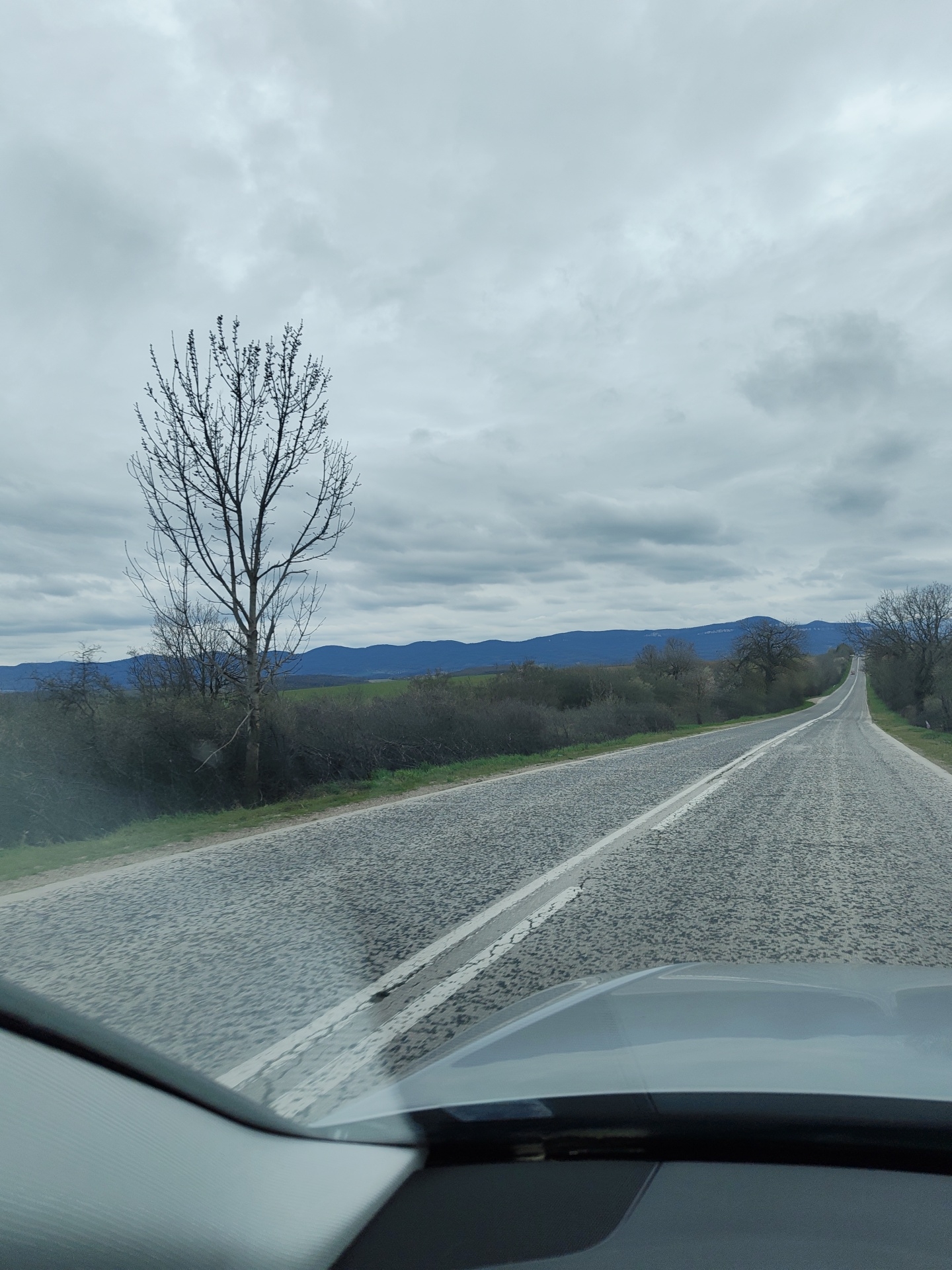 A road stretches into the distance under an overcast sky. The road surface is a textured gray, marked with a double white line. Scrub vegetation lines the left side of the road, with a leafless tree standing prominently. Distant hills can be seen on the horizon. The scene is viewed from inside a vehicle, with the dashboard visible in the foreground. The location is along the road into Mramoren, Bulgaria.