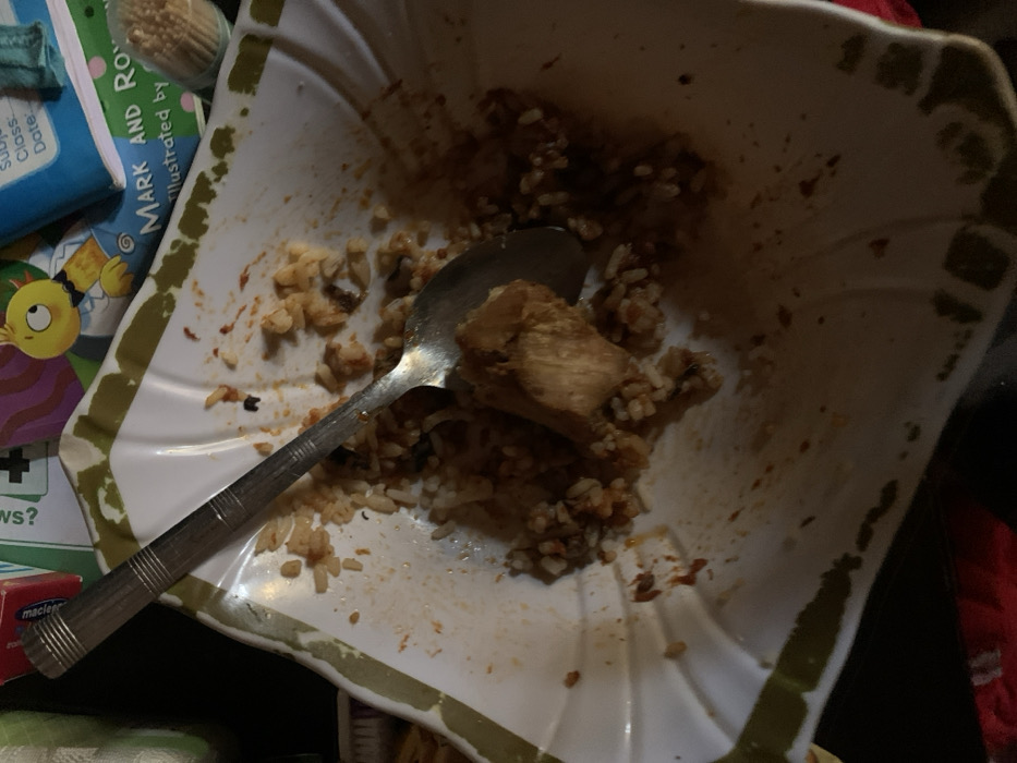 An overhead view captures a white, rectangular-shaped plate with a green patterned border, containing remnants of a meal. The plate is largely cleared but stained with red-brown sauce and scattered grains of light brown rice. A single piece of cooked, light-brown meat, consistent with poultry, rests among the rice remnants. A silver-colored metal spoon with a ridged handle lies within the plate, partially obscured by the food. The immediate background shows several items: a red box fragment on the left, an indistinct green object with a white mark, and to the right, a colorful children's book featuring a yellow cartoon character and partial text "Mark and Ro...". Adjacent to this is a blue notebook or book with visible labels "Subject:", "Class:", and "Date:". A clear cylindrical holder filled with wooden toothpicks is positioned next to the books, and a white brush or similar implement is partially visible on the far right edge. The lower portion of the image reveals red fabric. This scene is situated in Jos, Nigeria.