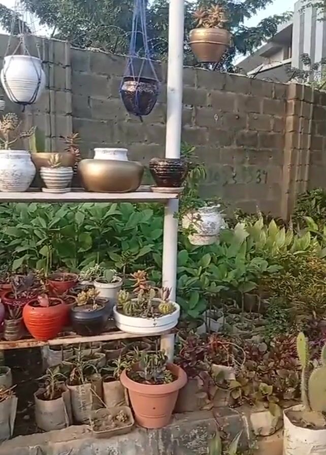 The camera pans slowly across a plant nursery in an urban area. There is a variety of plants in different colored pots, displayed on shelves and on the ground. In the background, a grey brick wall with numbers painted on it can be seen. Hanging pots are suspended from a metal frame. A concrete pole with "KR 111" written on it stands next to the plant nursery, marking the edge of the area. Beyond the plants, a street scene with trees, buildings, and possibly a road can be discerned.