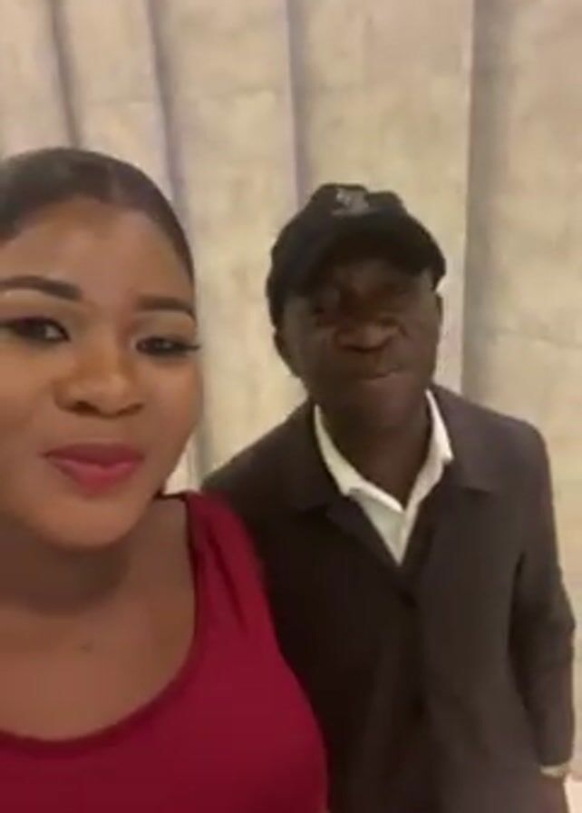 A woman with dark hair pulled back into a ponytail and wearing a maroon dress holds up a phone to record a selfie. She looks at the camera and smiles. A man wearing a black baseball cap and a dark jacket appears behind her and smiles at the camera. The background is a light-colored textured wall. They appear to be standing indoors.