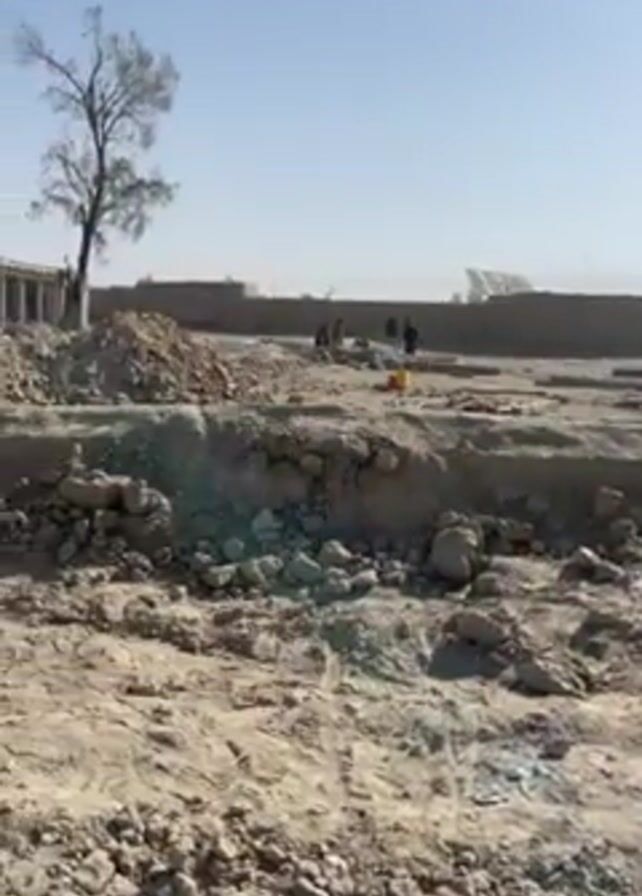 desolate, dusty landscape with remnants of destroyed buildings. The foreground is a rough, uneven terrain covered with rocks and dirt. In the background, a partially demolished building stands, showing its bare structure and broken walls. There's a group of men, dressed in traditional clothing, walking toward the building. The sky is clear and blue, suggesting a sunny day. A lone tree stands to the side, adding a touch of life to the otherwise barren scene.