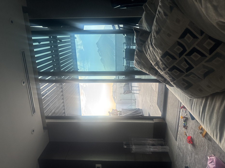 From inside a room, a bright window reveals a scenic outdoor area