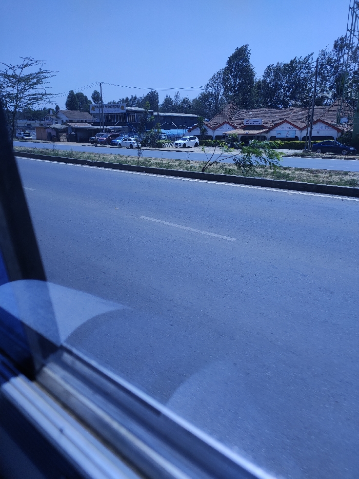 The image presents a static, daytime scene captured from the interior of a vehicle, looking across a roadway towards a commercial strip in Nairobi, Kenya