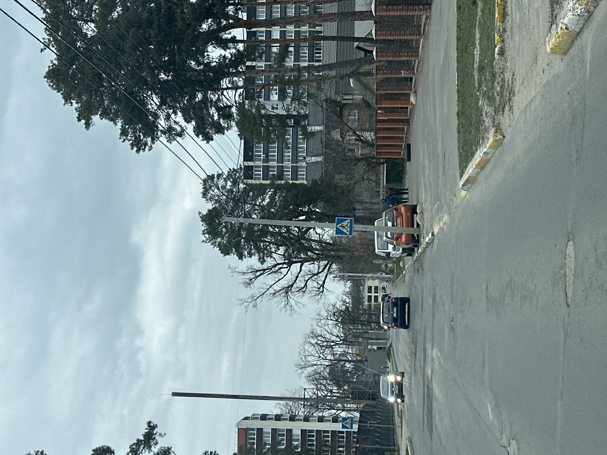 The image depicts a street scene in Irpin, Ukraine, under an overcast sky. The asphalt road shows signs of wear, including cracks and potholes, and is bordered by yellow and white painted curbs. On the road, a dark-colored sedan with illuminated headlights is driving towards the viewer in the left lane. Further ahead in the right lane, a dark blue hatchback is driving away from the viewer. Parked on the right side of the road, partially on the curb, is an orange hatchback with a partially visible license plate reading `AI 0804 CM`, followed by a white van. On the right-hand sidewalk, approximately three individuals, dressed in dark clothing, are walking away from the viewer, positioned near the orange parked car. A single black rubber tire lies on the sidewalk adjacent to a brick fence with metal sections. Architectural elements include a multi-story apartment building with white and reddish-brown sections on the left side of the street, and a larger multi-story building with a dark grey/black facade and numerous white-framed windows on the right, partially obscured by tall pine trees. Below this larger building, a smaller house with a grey pitched roof is visible behind brick fencing. Two blue pedestrian crossing signs are present on either side of the street. Tall utility poles with multiple overhead power lines run along the street. The environment includes numerous tall pine trees, particularly prominent on the right, and several bare deciduous trees further in the background. Small patches of grass are visible along the roadside.
