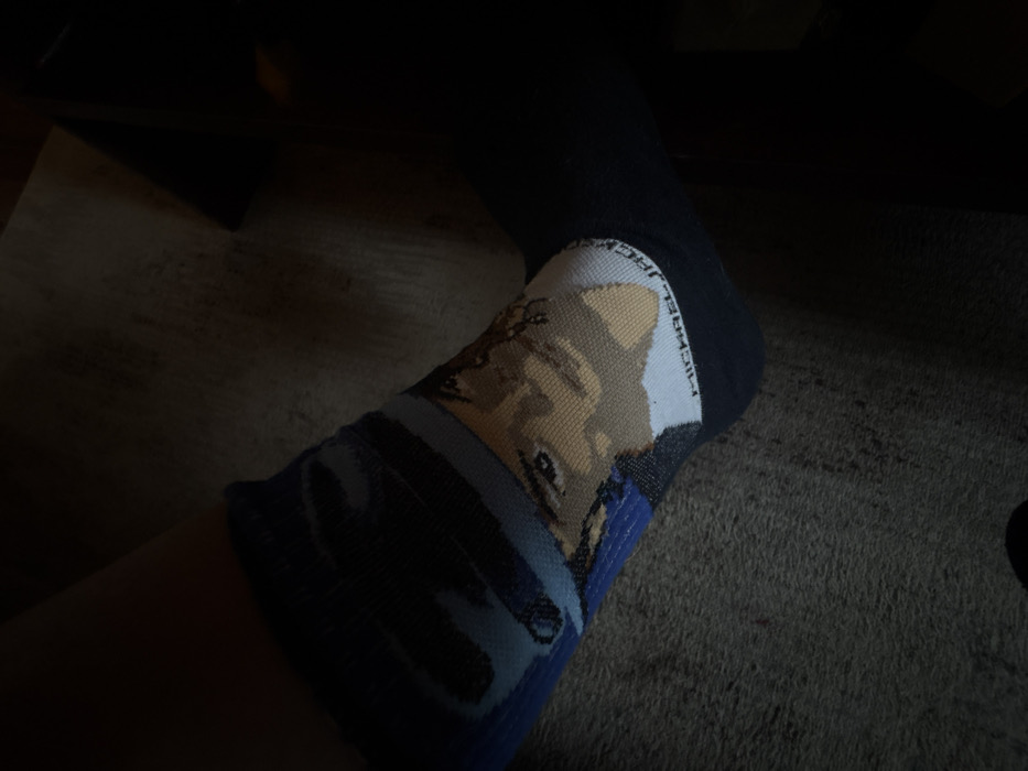 A human left leg and foot are partially visible, clad in a blue, grey, and white sock