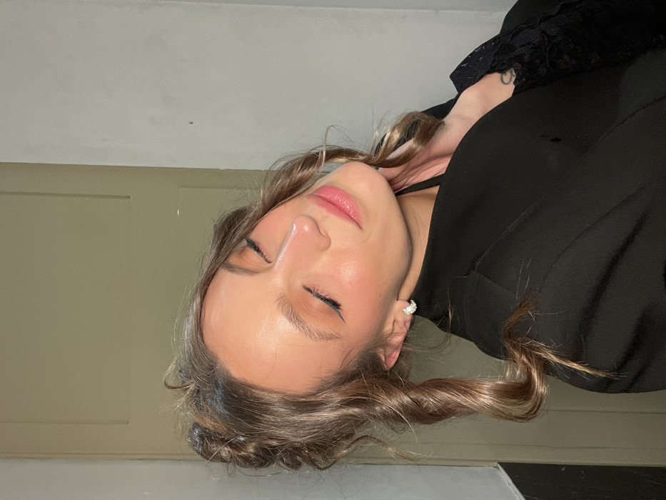 A woman with fair skin, closed eyes, and light pink lipstick. She is wearing a black blazer with a lace sleeve visible on her upper right arm, which also has a tattoo. Her light brown hair is styled in loose waves. She wears a sparkling earring in her left ear. Part of a light-colored wall is visible on the left side of the frame and a white marble surface is seen below.