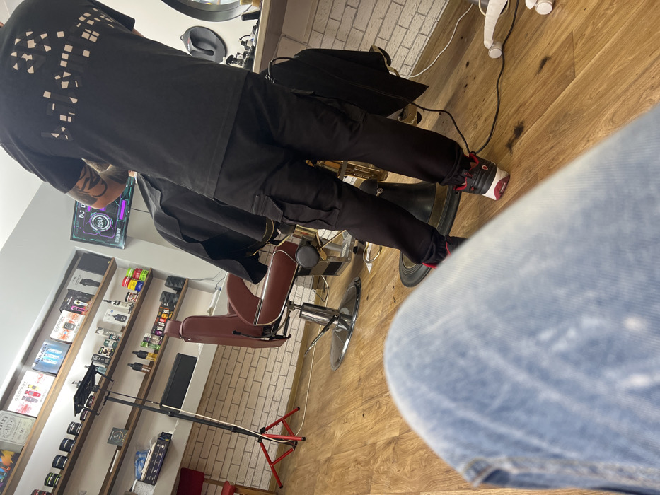The image displays the interior of a barbershop located in Kazanlak, Bulgaria. The perspective originates from a seated individual, with their light blue faded denim-clad thighs and knees prominently occupying the lower foreground. In the midground, a person, identified as a barber, stands with their back partially to the camera, wearing black cargo pants with elasticated cuffs and black, red, and white athletic shoes. A black grooming cape or smock is draped over a client, who is obscured from direct view, seated in a barber chair. Hair clippings are scattered on the light brown wood laminate floor around the barber's feet. To the left, a reddish-brown barber chair with chrome fixtures is visible. Adjacent to it stands a black tripod stand with a small black platform on a red base. The background features a white brick-patterned wall supporting multiple wooden shelves, which display an assortment of grooming products in bottles, jars, and retail packaging. A wall-mounted flat-screen monitor on the right side of the image displays a digital interface with "DJ Q" and a time indicator of "09:42". Reflections from a large mirror are partially visible on the far right. The area is brightly illuminated.