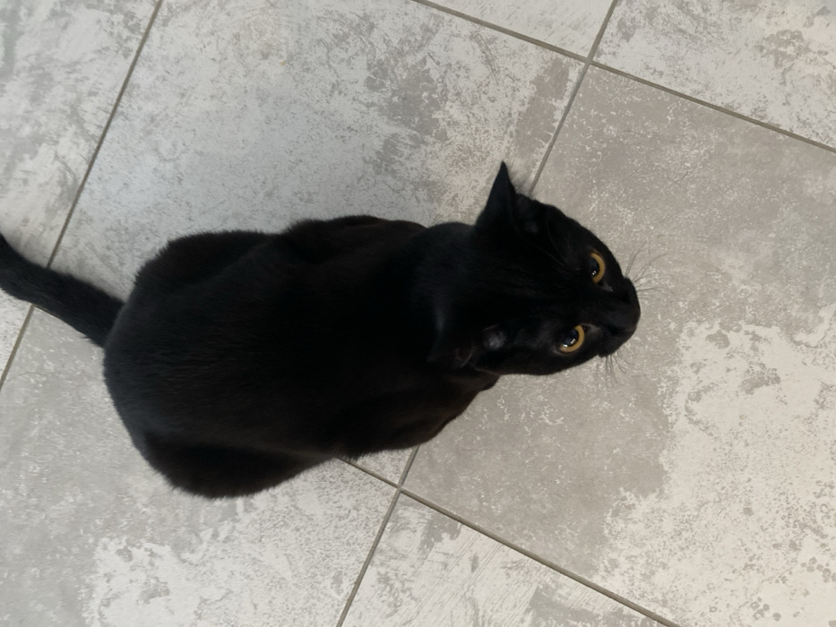 - "A black cat with short fur and bright yellow eyes is depicted from a high-angle perspective, situated on a tiled floor" by FM-cdksW2, licensed under CC BY 4.0