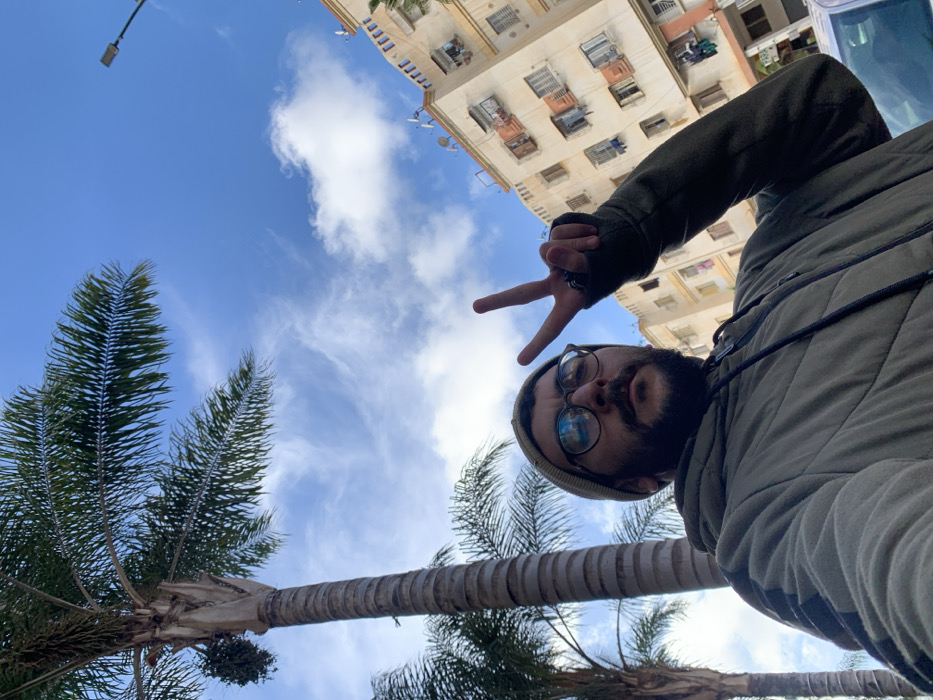 A male individual is depicted in a close-up, upward-angled selfie taken outdoors in Ouislane, Morocco