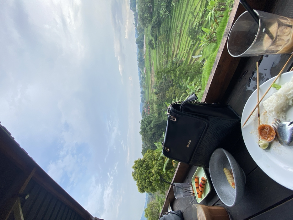 An outdoor dining scene is depicted, overlooking terraced rice paddies and lush green hills under an overcast sky in Tamiajeng, Indonesia. The immediate foreground features a dark wooden table with various dining items. From left to right on the table: a partial view of a dark object, a clear glass containing remnants of a dark beverage, and a small rectangular light green plate holding two skewers of grilled items topped with red sauce. Central to the table is a black quilted "Elizabeth" brand handbag with gold hardware and a chain strap. To its right, a grey textured bowl contains a single wrapped food item. In the lower right foreground, a white round plate holds remnants of a meal: white rice, a lime wedge, a spoonful of orange-red sambal, a silver fork and spoon, and several discarded wooden skewers. Further right, a tall clear glass with a black straw contains residual beverage. No individuals are visible. The scene suggests a recently concluded or ongoing meal at an elevated vantage point.
