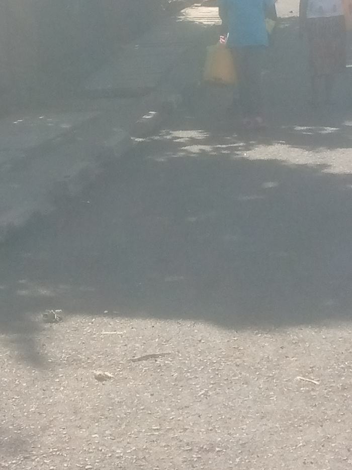 A slightly overexposed shot shows people standing on a paved road. Two figures are partially visible in the upper right, one in a white top and another person holding a yellow bag and wearing a blue shirt. Shadows from trees or structures fall across the pavement, creating darker patches. A few objects and debris are scattered on the road surface in the lower part of the image. The overall scene has a hazy or washed-out appearance.