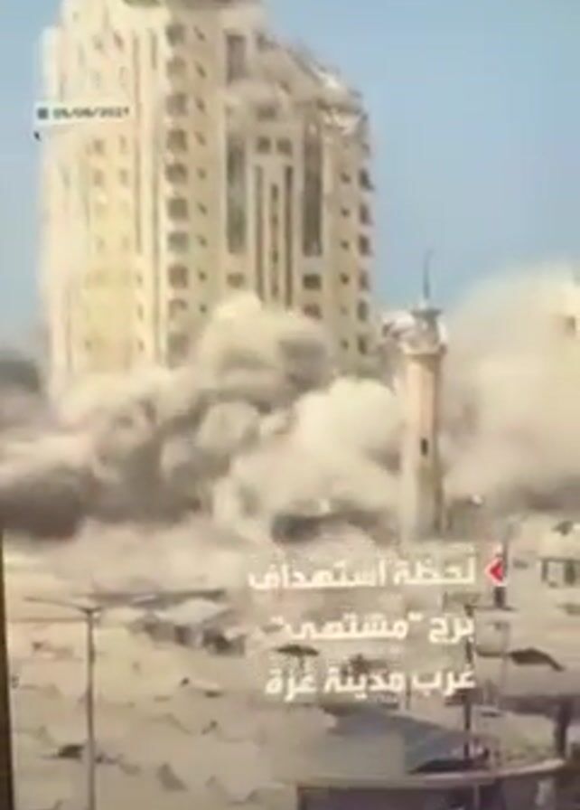 tall, light-colored building being destroyed by an explosion. Smoke and debris are billowing around the base of the building. In the foreground, there are smaller buildings and structures. The sky is light blue. Arabic text is overlaid on the video. The video appears to be taken from a distance, showing the full structure of the collapsing building and the surrounding environment.