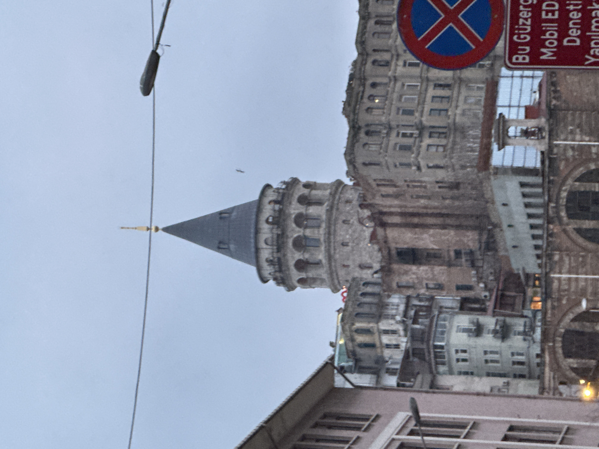 The image displays an urban landscape in Beyoğlu, Istanbul, Turkey, centered around the Galata Tower under an overcast sky. The Galata Tower, a medieval stone structure with a cylindrical base, multiple levels of arched windows, and a prominent dark gray conical roof topped with a golden finial, is the dominant subject, positioned slightly right of the frame's vertical center. Surrounding the tower are numerous multi-story buildings. To the left, a light-colored building with multiple rectangular windows and a sloped roof is partially visible. Densely packed, older buildings with various windows and architectural details occupy the space below and to the right of the tower, some appearing aged or partially dilapidated. Lower structures with distinct arched sections are visible in the foreground. Essential objects include a black street light arm extending from the upper right quadrant, a thin horizontal wire crossing the upper sky above the tower's finial, and two partial traffic signs on the right: a circular "No Parking" sign (red circle with a blue 'X') and a rectangular red sign with white Turkish text reading "Bu Güzergah Mobil EDS Denetimi Yapılmaktadır" (This route has mobile enforcement/surveillance). Scattered points of interior light are visible in windows of various buildings. A small, dark bird is airborne in the upper right sky. No human figures are discernible. The overall lighting is diffuse, indicative of an overcast day.