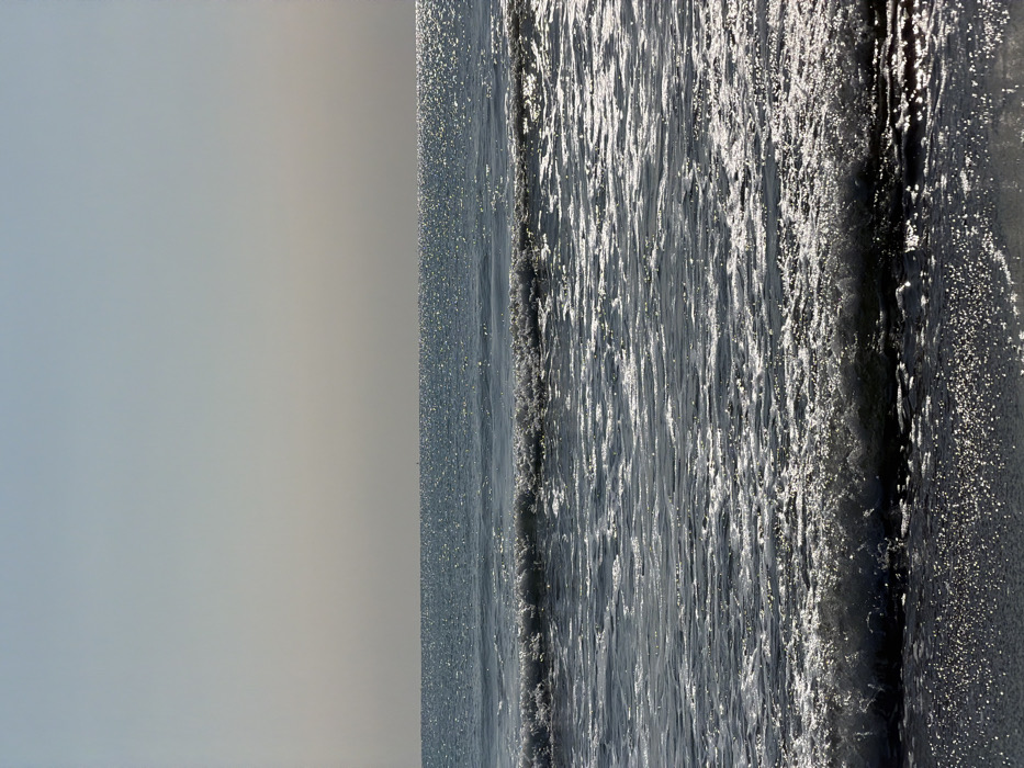 The image displays a horizontal view of the ocean meeting the sky. The right side is dominated by the glistening, textured surface of the water, reflecting light and suggesting movement. To the left, the sky is a soft, uniform color, providing a contrasting backdrop to the dynamic ocean. The horizon line is subtle, almost blending into the overall composition, giving a sense of vastness.