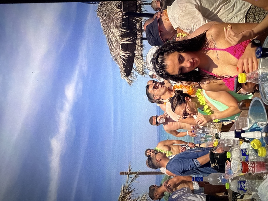 This image depicts a crowded outdoor gathering on a sunny day at a sandy beach adjacent to a clear blue sea. The sky is bright blue with faint cirrus clouds. The location is a beach with a visible body of water; this contradicts the provided location of Cherven Bryag, Bulgaria, which is an inland city. Approximately 15-20 individuals, predominantly young adults, are visible, many wearing leis (flower garlands) in orange and green, indicative of a themed event. Two straw beach umbrellas provide shade. In the immediate foreground, a woman with long dark hair, wearing a bright pink ruffled bikini top and yellow painted fingernails, is looking down at a black smartphone held in both hands. A small tattoo is visible on her upper left chest. To her left, another woman with dark hair tied back, wearing a light green top and green lei, drinks from a clear plastic cup while wearing sunglasses. An improvised bar or table in the foreground holds various bottles and containers: multiple "Didi" brand water bottles, a Coca-Cola bottle, several clear plastic cups, a tall clear bottle resembling vodka, a blue-labeled bottle, and a champagne-style bottle in a silver ice bucket. Yellow bottle caps are scattered on the surface. Behind the foreground individuals, a man in a light blue short-sleeved collared shirt and sunglasses stands facing left. Further back, numerous men are seen socializing, some shirtless, some wearing light shirts and leis. One shirtless man in the mid-ground holds a clear plastic cup to his mouth. Another man in a light beige polo shirt and orange lei stands observing to the right. A man wearing a white bucket hat with red trim and a white shirt, also with an orange lei, is positioned behind the woman in pink. The background shows more individuals partially submerged in or standing near the shallow, clear blue water.