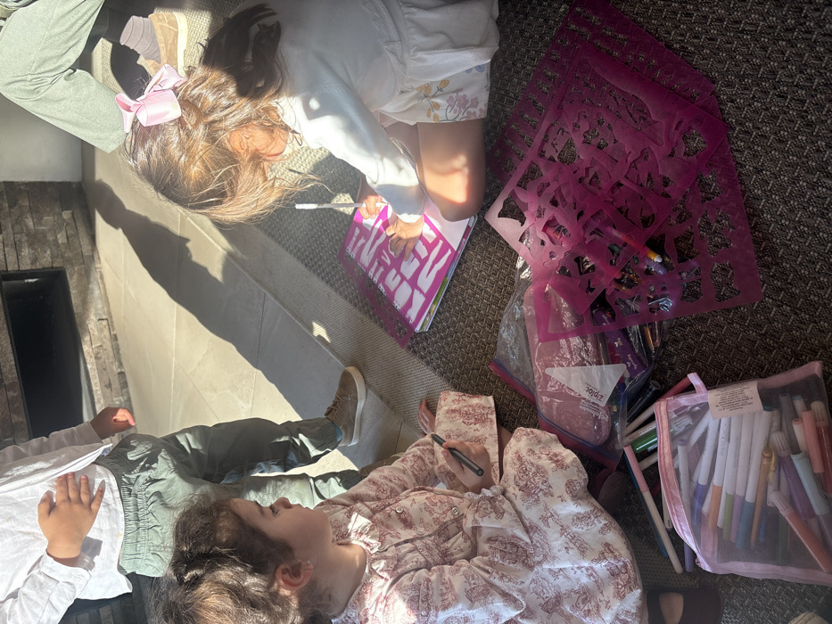 An indoor scene in Valle de Bravo, Mexico, displays four individuals. Two young girls are seated on a dark patterned rug, engaged with art supplies. The girl on the right, with brown hair secured by a pink bow, wears a light-colored dress and actively draws in a pink spiral-bound notebook, which contains fashion-themed templates, using a white pen. The girl on the left, wearing a patterned dress, holds a black marker and observes the first girl. Scattered around them on the rug are multiple pink plastic stencils and clear plastic pouches filled with various markers. In the background, a third child, wearing a white shirt and green pants, stands partially visible near a stone-clad fireplace. To the far right, an adult's legs, clad in green pants and light-colored shoes, are visible. Strong natural light illuminates the area, casting distinct shadows across the rug and adjacent light-tiled floor.