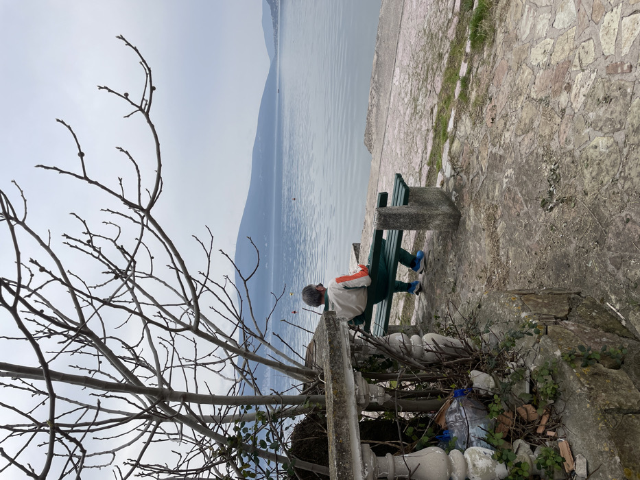 The image captures a waterside scene in Donja Lastva, Montenegro, under an overcast sky. A single individual, viewed from behind, is seated on a dark green wooden bench with grey stone supports, facing the placid grey-blue water of the bay. The person wears a cream-colored jacket with orange shoulder and sleeve accents, dark green trousers, and blue athletic shoes, and has short grey hair. In the foreground, on the left, a weathered concrete balustrade with ornate white balusters and a dark cap is present, partially obscured by sparse, dry vegetation and some green foliage. Below and behind the balustrade, a clear plastic container with a blue liquid and other discarded items are visible. The ground directly in front of the bench and extending to the right is a rough, uneven surface composed of light-colored, irregularly shaped flagstones interspersed with patches of dirt and minimal grass. The bay's surface is calm, reflecting the muted light of the sky. Several small, colored buoys—predominantly red and yellow—are scattered across the water. Distant, dark-hued mountains rise from the far shoreline, their forms softened by the atmospheric conditions. Bare tree branches, likely deciduous, with visible small buds or fruit (possibly figs), dominate the upper left and central-left portions of the frame, framing the expanse of water. A faint outline of a vessel is visible near the distant coastline.