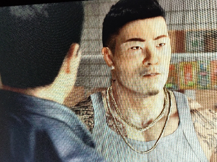 The depicted scene is set in Hoenheim, France, rendered in a low-resolution format consistent with a screen capture, exhibiting visible pixelation and scan lines. Two individuals are present. One individual's back, head, and left shoulder are visible in the foreground, wearing a dark blue or grey collared garment. This person is facing towards the right side of the frame, interacting with the second individual. The second individual, an East Asian male, occupies the mid-ground, facing towards the viewer's right. He possesses short, dark, closely-cropped hair with shaved sides, and a short goatee. His expression is neutral to serious. He wears a light grey or white sleeveless tank top, multiple gold-colored chain necklaces of varying lengths, and a small stud earring in his left ear. Extensive dark-colored tattoo work is visible on his left shoulder and upper arm, displaying intricate patterns. The background consists of an indistinct, vertically textured wall or surface with block-like patterns of varied colors, including browns, reds, oranges, and greens, suggesting stacked items or a painted design. The lighting is uniform throughout the scene.