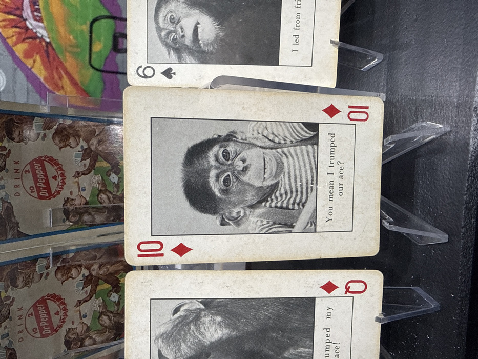 The image displays vintage playing cards featuring chimpanzees. The top card, a 6 of spades, shows a chimp with the caption "I led from fri." Below it is the 10 of diamonds, with a chimp wearing a striped shirt, saying, "You mean I trumped our ace?" A glimpse of the Queen of diamonds appears at the bottom, with the words "umped my ace!" Stacked beside them are card boxes advertising Dr. Pepper with chimpanzee illustrations.