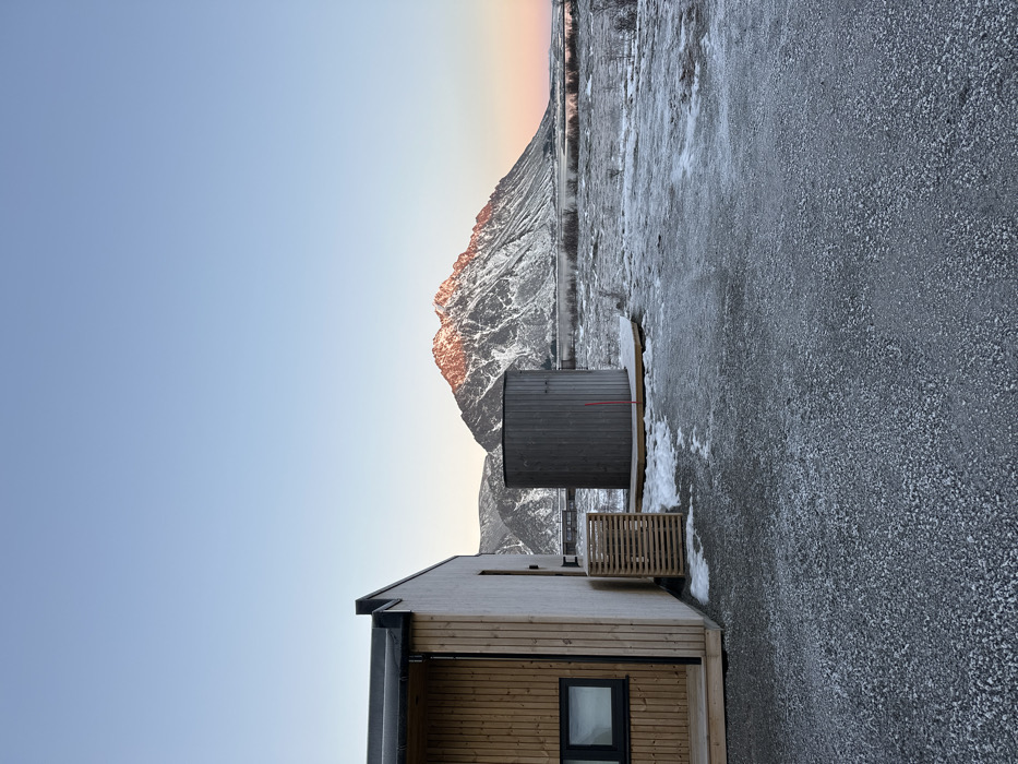 The image depicts a winter scene in Kleppstad, Norway, under a clear sky during either sunrise or sunset, evidenced by the low-angle, warm light illuminating distant mountain peaks. In the foreground, the ground consists of dark gravel mixed with frost and patches of snow. To the left, a modern, light wood-clad building with a flat dark roof features a rectangular window with a black frame on its side. Adjacent to the building, a light wooden slatted structure, possibly a cover or vent, sits on the frosted ground. In the midground, a dark cylindrical wooden structure, likely a sauna or hot tub, rests on a light wooden platform, with a red pole positioned next to it. Beyond this, a flat, snow-dusted landscape with sparse, dark vegetation extends towards a body of water, possibly a fjord or lake, which reflects the pale pink and blue hues of the sky. The background is dominated by a large, snow-covered mountain range, with its highest peaks brightly illuminated by golden light from the low sun. A bridge or elevated structure is faintly visible across the water in the far distance. No people, actions, or direct interactions are visible in the scene.