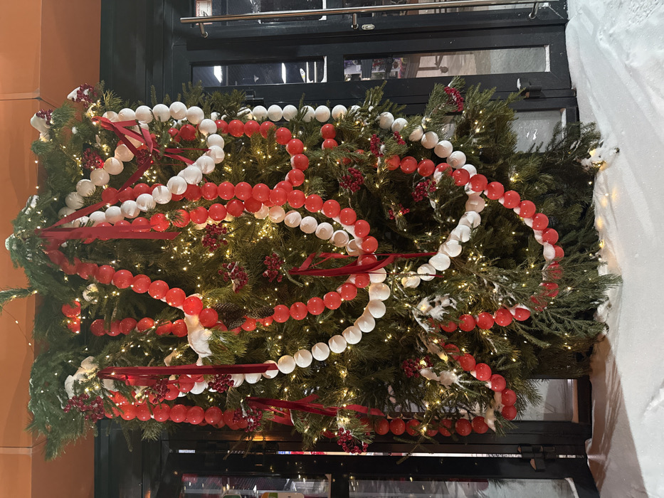 A large, heavily decorated evergreen tree stands outdoors, likely in Perm, Russia, covered in a fresh layer of snow on its branches and the ground. The tree is adorned with numerous strands of spherical red and white beads, draped both vertically and horizontally. Interspersed among the beads are red ribbons, some tied into bows, and clusters of artificial red berries. Several pinecones are also visible. Warm-toned string lights are interwoven throughout the foliage, providing illumination. The tree is positioned in front of a dark-framed glass door or window structure, likely an entrance to a commercial building, reflecting ambient light from within. The scene is observed under low-light conditions, suggesting evening or night. No individuals are present in the frame. The precise location within Perm, Russia, cannot be determined from the provided visual information.