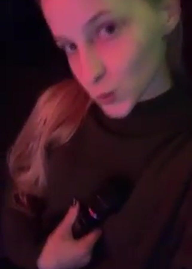 A young woman with fair skin, light blonde hair, and wearing a dark green turtleneck sweater, holds a black microphone. She gives a small pout, then winks at the camera. The scene is darkly lit with colored lights that alternate between pink and green.