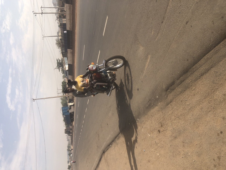 Two adult males are depicted riding a motorcycle on a paved road in Hanwa, Nigeria