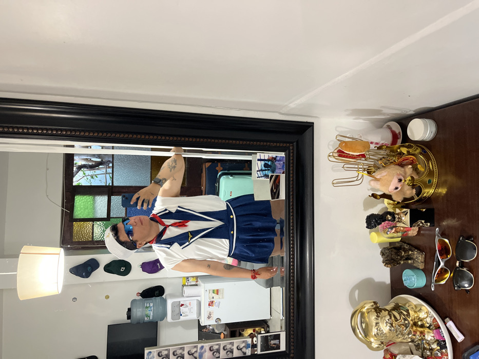 An individual is depicted indoors, taking a mirror selfie. The person is dressed in a sailor-themed costume consisting of a white sleeveless top with a blue V-neck overlay, a red neckerchief, a white sailor's hat, and a dark blue pleated skirt. Blue sports sunglasses cover the eyes. The individual holds a light blue smartphone in their right hand, positioned to capture the reflection. A watch is visible on the left wrist, and a red string bracelet is on the right. Tattoos are present on the left arm. The individual's left arm touches the dark, ornate frame of the mirror. In the background reflection: A white ceiling light fixture hangs above. Several baseball caps are suspended on a wall to the left, beneath which a black flat-screen television is mounted. A white water dispenser with an inverted bottle stands next to a white compact refrigerator. A vertical photo display unit featuring multiple small black and white photos is situated left of the refrigerator. Through a doorway behind the individual, a room with a window featuring multi-colored glass panes (green, brown, blue) and visible outdoor foliage is seen. A light blue suitcase is on the floor in this background room, with another darker suitcase partially visible behind it. A small rectangular image, possibly a boxing scene, is taped to the lower right corner of the mirror. In the foreground, below the mirror, a dark wooden surface, likely a dresser, displays various objects: A large golden dog sculpture sits on a white oval tray filled with small items. To its right are a light blue dish, an elephant figurine, and other small sculptures. A golden crown-shaped holder contains a small beige plush toy and a gold wire rack holding several hair accessories. Two pairs of sunglasses are placed on the surface: one with reflective orange lenses and a silver frame, and another with dark lenses and a black frame. A small white cylindrical jar is on the far right. The walls are white. The specific city location of Arica, Chile, is not visually discernible from the image content.