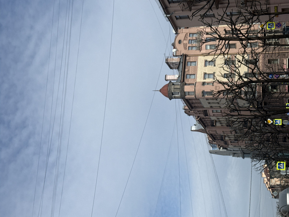 The image depicts an urban street scene in Saint Petersburg, Russia, specifically at the intersection of Nevsky Prospect and Bakunina Avenue, featuring the building at Nevsky Prospect, 142. The upper two-thirds of the frame are dominated by a light blue sky with scattered white, wispy clouds and multiple dark overhead utility wires running horizontally. The lower third of the image shows multi-story buildings, primarily a distinctive corner building with a faded pink and beige facade, featuring a prominent reddish-brown conical turret at its apex. This building has multiple windows and visible chimneys on its roofline. Adjacent buildings continue along the street, exhibiting similar architectural styles and muted color palettes, some with visible balconies. In the midground and foreground, numerous bare deciduous trees with dark, intricate branches stand, partially obscuring the buildings. Several standard Russian street signs are visible, including yellow triangular signs with black pedestrian symbols, indicating pedestrian crossings. A portion of a light-colored vehicle (likely a car or van) is visible in the bottom left corner. No individuals or specific actions are discernible. The scene is illuminated by natural daylight, suggesting a clear or partly cloudy day.