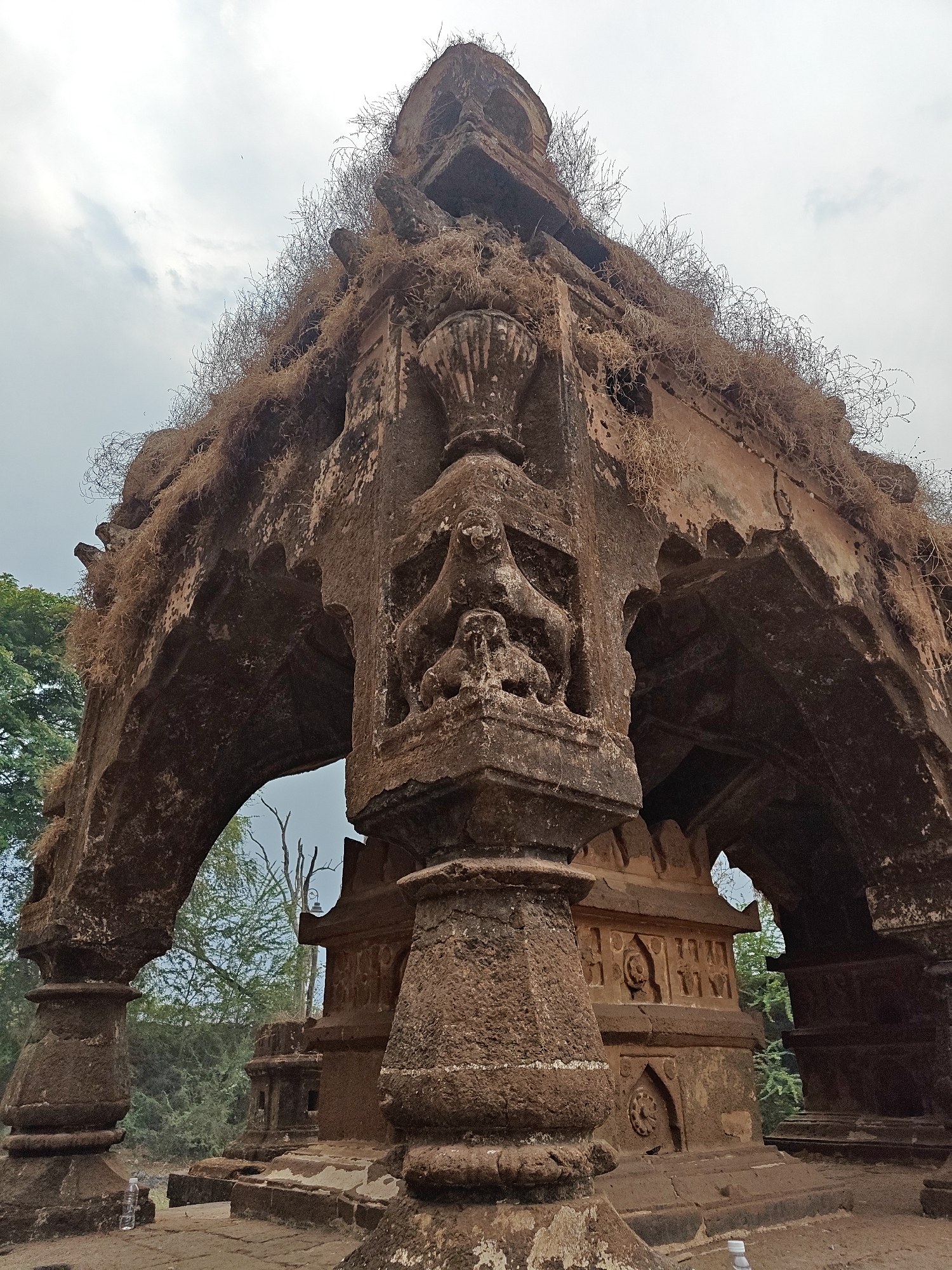 The image displays a severely weathered, reddish-brown stone temple or memorial structure situated in Kolhapur, India. The primary subject is a multi-tiered edifice constructed from a coarse, reddish-brown stone, possibly laterite, exhibiting extensive erosion and material decay. The structure's upper sections are densely covered with dry, straw-like vegetation. A prominent pillar in the foreground features detailed relief carvings, including a decorative pot finial, a multi-headed cobra (Naga), and a figure seated upon a lion. An arched opening to the left reveals an interior space and a smaller, secondary stone shrine-like structure beyond, which also displays carved panels, one with a prominent circular motif. The environment includes an overcast, light grey sky visible overhead. Green foliage from trees is present to the left of the main structure and discernible through its archways, indicating a natural or semi-natural outdoor setting. The immediate ground level consists of uneven dirt and weathered stone. A clear plastic water bottle is visible on the ground near the base of the main structure. No people or animals are present, and no active interactions are depicted.