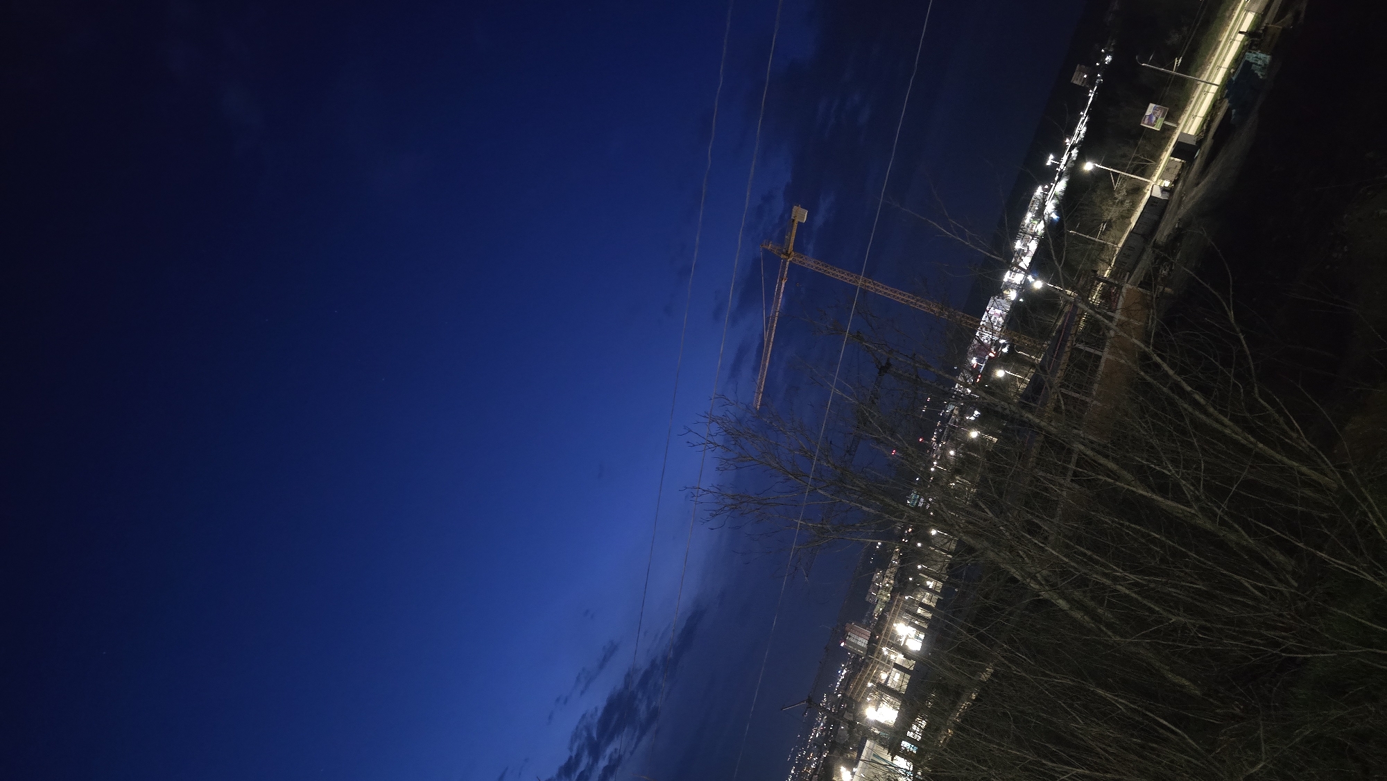 The image presents an elevated, diagonally oriented nighttime view of Pleven, Bulgaria. The sky is a deep indigo blue, revealing scattered faint stars and partially obscured by dark, broken cloud formations. In the foreground, a dense cluster of bare deciduous tree branches and slender trunks dominates the lower-left and central portions of the frame. Two dark, taut utility lines traverse horizontally across the mid-ground. The urban landscape of Pleven extends across the mid-ground and background, characterized by numerous scattered white and yellow lights emanating from buildings and streetlights. A prominent yellow-orange lattice tower crane, with its jib extending horizontally, is positioned in the mid-right. A segment of a road or highway, lined with regularly spaced streetlights and featuring an indistinct billboard, is visible in the lower-right. Distant hills or terrain form a dark, undulating horizon line against the sky. No individuals, discernible active vehicles, or specific human activities are visible.