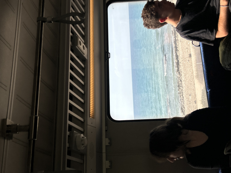 The image displays the interior of a train carriage overlooking the Mediterranean Sea, located along the coast of Haifa, Israel