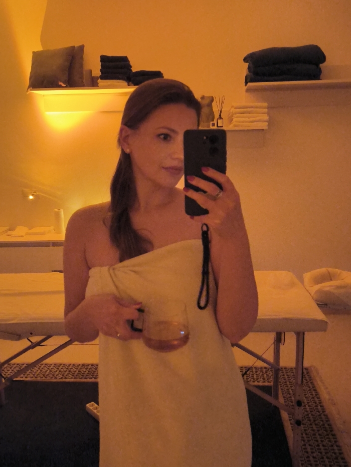 An adult female is depicted taking a mirror selfie in an indoor setting, identified as the city of Unknown, Unknown. The subject, with brown hair, is wrapped in a light-colored towel and holds a dark-colored smartphone in her right hand, using it to capture her reflection. Her left hand holds a clear glass mug containing a light-brown liquid. She wears a ring on her left ring finger and has pink nail polish. The environment is a spa or wellness room, characterized by warm, orange-toned lighting. Two massage tables with light coverings are visible; one partially on the left and another on the right with an adjustable headrest. The background features two light-colored wall shelves. The upper left shelf holds a dark cushion and stacked dark towels. The upper right shelf holds stacked dark towels. The lower right shelf displays stacked light-colored towels, a small decorative figure (possibly an animal), and a reed diffuser. A wall-mounted light fixture is present on the left wall, and an illuminated strip runs beneath the left shelf. The floor is covered with a dark, patterned mat.