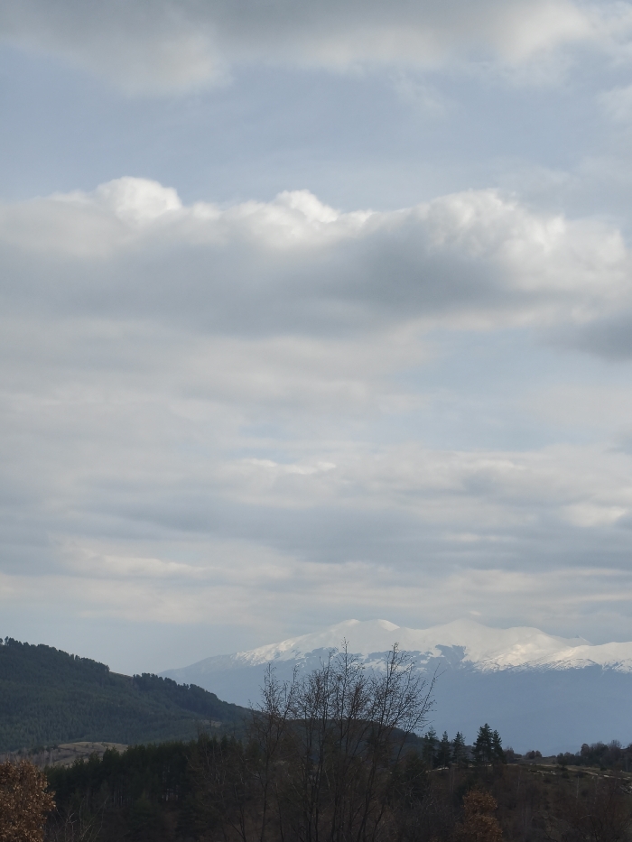 The image presents a panoramic landscape view near Valkosel, Bulgaria, under an overcast sky. The upper two-thirds of the frame are dominated by a light blue and grey sky heavily layered with stratocumulus and cumulus clouds. In the distant background, a range of snow-capped mountains with rounded contours appears white and light blue-grey. Closer to the foreground, a prominent section of mountains is covered by dense, dark evergreen forest. The immediate foreground contains several deciduous trees with bare, intricate, dark brown branches, silhouetted against the forested hills. Patches of rust-colored foliage are visible at the far left and right edges of the foreground. The lighting is diffused, with no strong shadows evident. No individuals, human activity, or man-made structures are present.