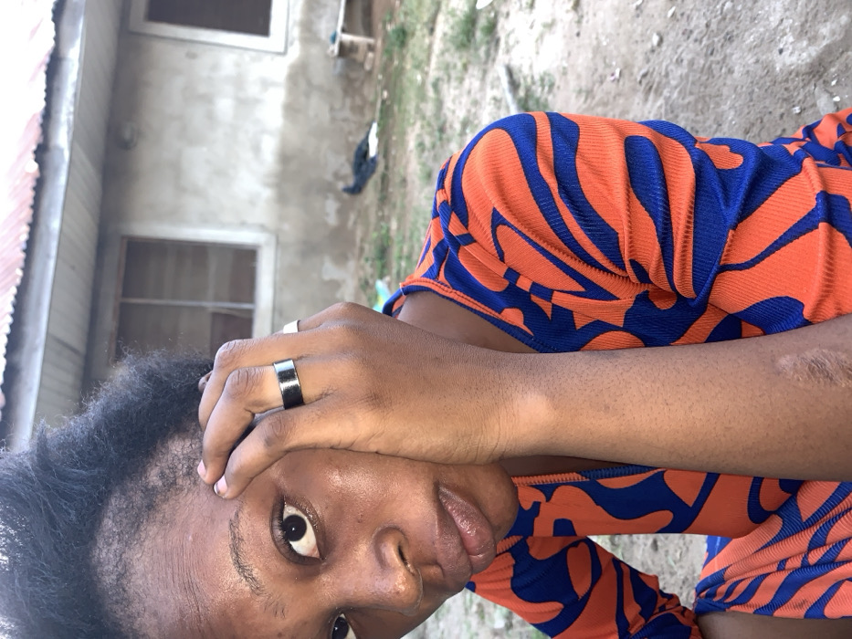This image captures a close-up portrait of an individual, appearing female, positioned outdoors in Minna, Nigeria. The subject, with dark skin and dark, kinky hair, looks directly forward. Her right hand is raised, with the palm resting against the right side of her face and temple. A wide, dark-colored ring is visible on the ring finger of her right hand. A lighter patch of skin and a scar are present on her visible right forearm. She wears a long-sleeved garment patterned with prominent, irregular blue and orange shapes. In the background, a single-story building with unpainted, light-toned concrete walls and a reddish-brown corrugated metal roof is visible. Two rectangular windows with dark frames are present on the building's facade. The ground is bare, dry earth. To the right, near the base of the building, a dark-feathered bird is observed on the ground, alongside a small, light-colored wooden structure. The specific location within Minna is not discernible from the provided visual information.