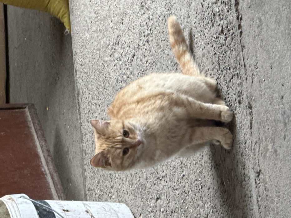 - "A domestic short-haired cat with orange and cream-colored fur is observed sitting on a grey, textured concrete surface in Kozlovets, Bulgaria" by FM-2MMkW2, licensed under CC BY 4.0