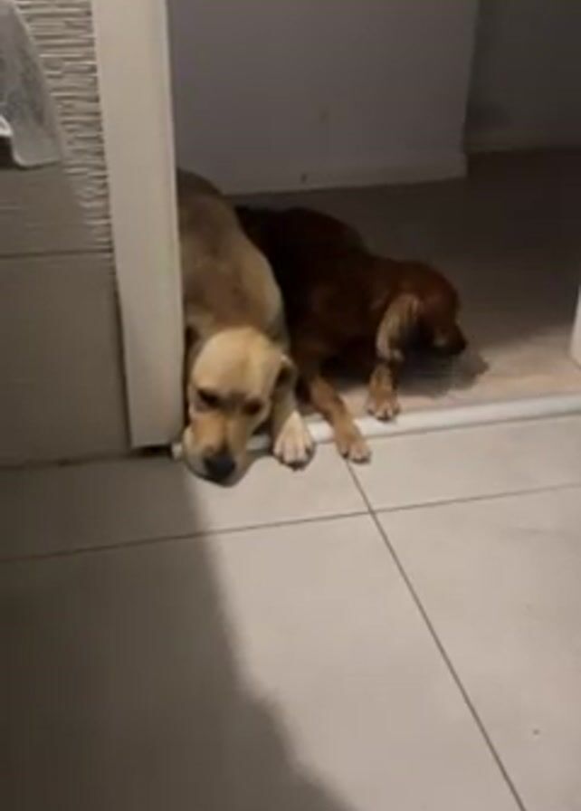 Two dogs lie together between a doorway and the room beyond. One dog is mostly tan, with a black nose, and lies with its head down. The other dog is brown, looks alertly into the camera, and wags its tail. The floor is tiled.