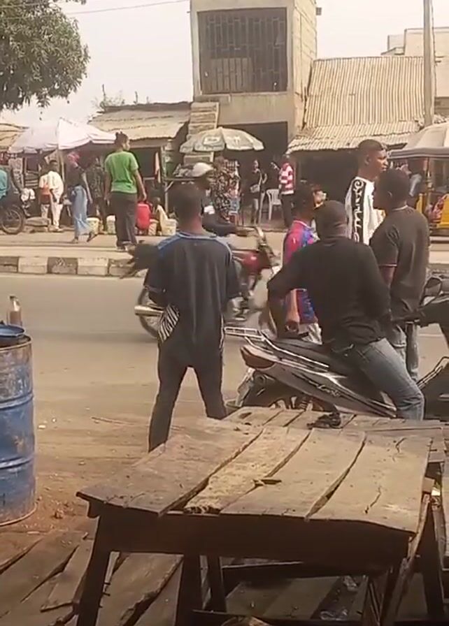 street scene in what appears to be an African town. Several people are visible on the street and along the sidewalk, including a man in a green shirt, a man in a white and black shirt, and a woman wearing a jersey with blue and red stripes. Three men stand around a motorcycle on the side of the road, leaning against it. A yellow auto-rickshaw or "tuk-tuk" is parked on the opposite side of the street. In the foreground, there are weathered wooden tables, with a blue barrel nearby. The buildings appear somewhat old and the sky is overcast, giving the scene a slightly dusty look. There is also a distinctive high-pitched vehicle horn sound at the beginning.