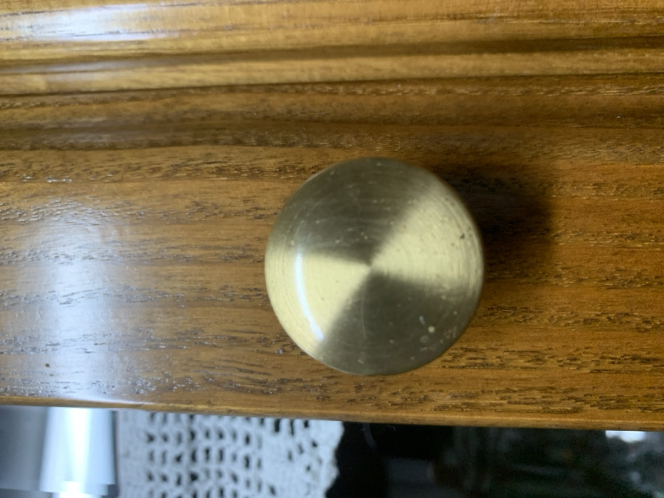 A brass-colored, circular knob is positioned on a textured, light brown wooden surface