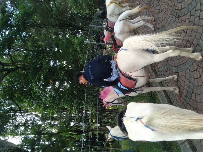 Several white ponies, with colorful saddles and bridles, are lined up on a brick-paved path. One pony has pink-dyed forelocks. A person is mounted on one of the ponies, wearing a dark jacket and light-colored pants. Trees fill the background. A metal fence runs along the left side of the ponies. The image is rotated counter-clockwise.