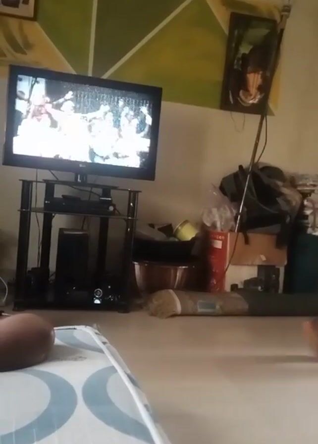 living room setting. In the foreground, there's a light-colored ottoman with a pattern of blue and white circles. Slightly out of focus, a dark-skinned person's leg or foot is visible resting on the ottoman. The main focus is on a television set placed on a black, multi-tiered stand. The TV is showing a video of a dark-skinned man speaking and smiling. Behind the television and to the right, there is a collection of items including a box, a red container, a broom or brush, and various miscellaneous objects. There's a picture hanging on the wall with a green and yellow geometric pattern behind the TV. Another framed picture hangs on the wall to the right of the TV. The general impression is that the room is a bit cluttered.
