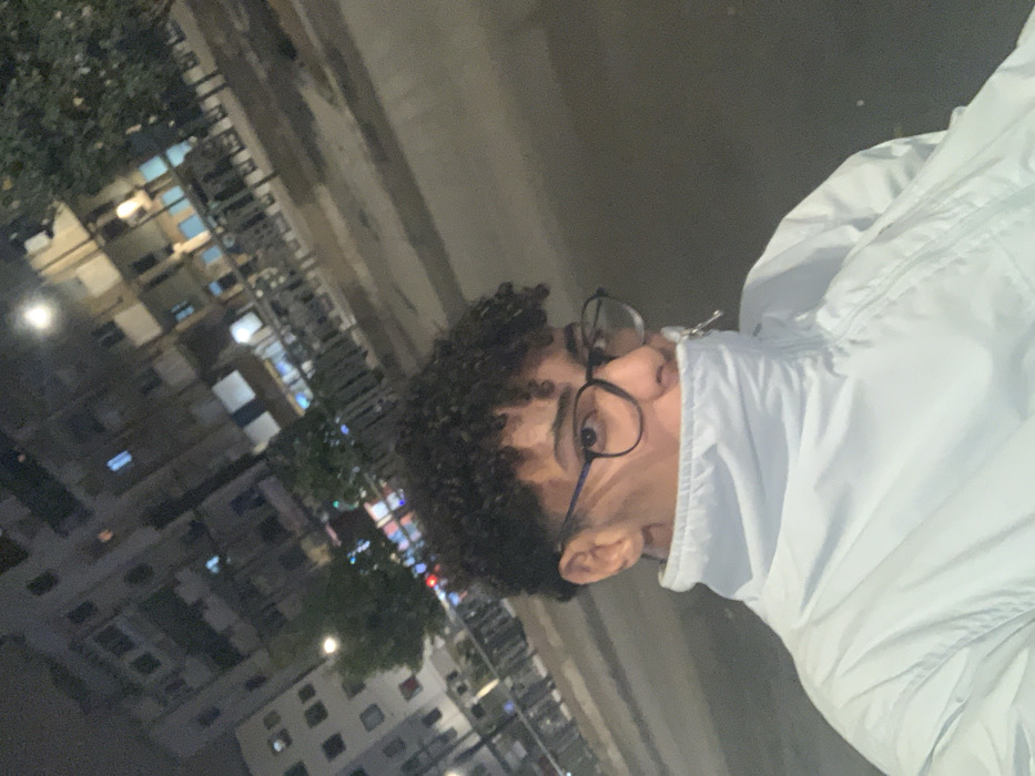 A person with curly hair and glasses wearing a white jacket is centered in a tilted outdoor shot. Buildings with lit windows and trees line the background, suggesting an urban nighttime setting. The person's face is partially obscured, with the focus on their eye and the frame of their glasses. The background is blurred.