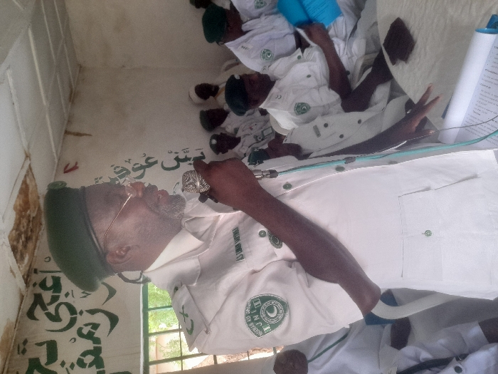 An older man, wearing a green beret and white uniform with a round logo patch, speaks into a microphone. He has a beard and wears glasses. Several people in similar white uniforms are seated behind him. Arabic calligraphy is visible on the wall next to a window. Some papers and blue-colored items are seen on a table.