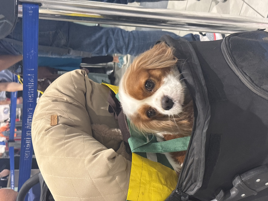 A Blenheim Cavalier King Charles Spaniel dog is depicted in a black soft-sided pet carrier, looking directly forward, at Ben Gurion Airport, Terminal 1, Israel