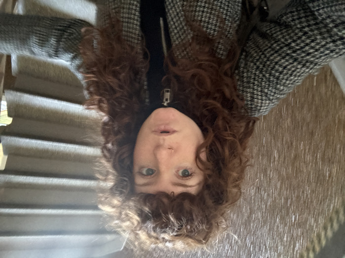 An image taken in an interior stairwell in Suresnes, France, depicts a single female subject facing forward. The individual has fair skin, light-colored eyes, a small metallic piercing in her left nostril, and voluminous, curly, auburn-red hair styled with bangs. Her mouth is slightly ajar, and her expression is neutral. She is dressed in a black high-collared garment with a partially unzipped silver-toned zipper, topped by a grey and white houndstooth pattern jacket. The background on the left features a vertically textured, brown and beige wall, while the background on the right reveals a curving ascent of light-colored steps, consistent with a spiral staircase.