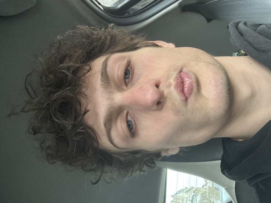 The image captures a close-up portrait of a young adult male inside a vehicle