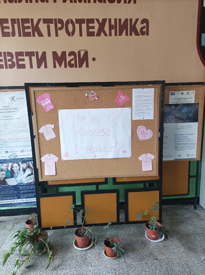 The image displays an indoor public area, likely within an educational institution, located in Cherven Bryag, Bulgaria. The background is a light tan wall featuring large, stenciled dark brown Cyrillic text, reading "ЕЛЕКТРОТЕХНИКА" (Electrotechnics) on the top line and "СВЕТИ МАЙ" (Saint May) on the line below. A framed cork board, centrally positioned, exhibits an anti-bullying display. A prominent white sheet of paper in the center bears the handwritten Cyrillic message "Не на тормоза в училище!" (No to bullying in school!), flanked by drawn outlines of human hands and small pink heart stickers. Various pink paper cutouts in the shape of T-shirts are pinned around the central message; some contain Cyrillic text such as "НЕ" (No), while others feature outlines of a heart or two figures. A circular "STOP" sign sticker is affixed above the central message. A white printed document and a pink heart-shaped cutout with text are also present on the board. To the left of the main board, a partial display shows a poster with images of students. To the right, a narrower cork board holds printed documents, one visible with "BG05SFPR001-3.001-0001" and text pertaining to professional education and training. Below the main cork board, a series of dark-framed, tan-colored panels comprise the lower section of the display structure. The floor is covered with light gray tiles arranged in a grid pattern. Four potted plants are positioned on the floor in front of the display: a larger plant with green, somewhat drooping foliage in a dark pot to the left, and three smaller plants with green leaves, each in a terracotta-colored pot with a white saucer. No individuals are visible, and no dynamic actions or interactions are depicted within the scene.