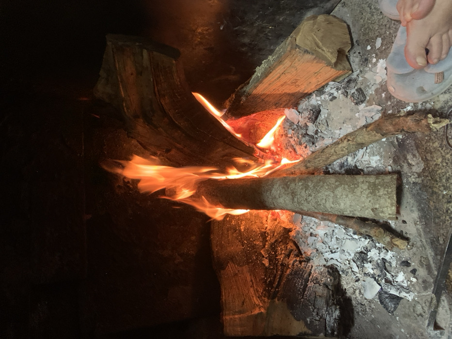 A fire burns brightly in a hearth, with flames licking at the logs arranged in a semi-circle. Ash and burnt remnants surround the fire. A partially visible pair of feet clad in light blue flip-flops is present in the upper right corner, adding a human element to the scene. The background is dark, emphasizing the light and warmth of the fire.