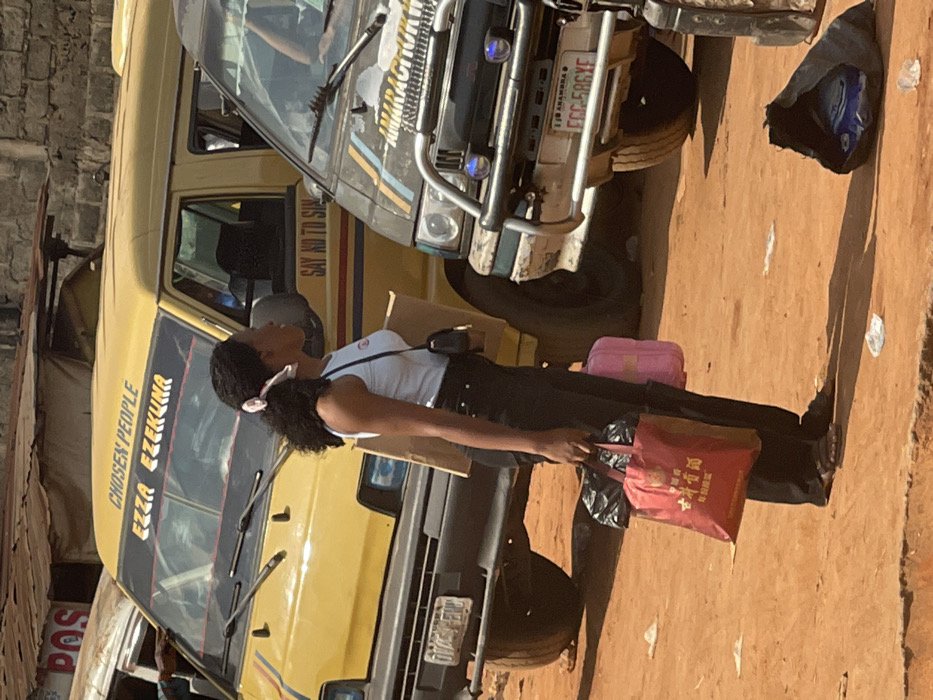 In Nkpor, Nigeria, a young woman stands in profile on a reddish-brown dirt road, facing right. She wears a white sleeveless top, black trousers, and dark sandals, with her dark, curly hair tied back by a light-colored scrunchie. A small black shoulder bag hangs on her left side. In her left hand, she carries a red shopping bag with white characters, a black plastic bag, and a small pink bag. A brown cardboard-like object is partially visible behind her left shoulder. Behind the woman, two commercial vans or buses are positioned on the unpaved road. The yellow van to the left displays "CHOSEN PEOPLE" and "EZZA EZEKUNA" on its windshield and "SAY NO TO SIN" on its side. A partial license plate is visible on its front bumper. To the right, a darker-colored van or bus features a prominent metal bull bar with two blue lights. Its license plate clearly reads "ANAMBRA ECC-586XF," and "AMARACHUKWU" is visible on its front. Both vehicles appear to be worn. The ground is an unpaved reddish-brown dirt surface with scattered small debris. To the right of the woman, a black bag lies open on the ground, containing a blue object. In the far left background, a structure with a corrugated metal roof and a partially visible "POS" sign can be seen. The scene is illuminated by daylight.